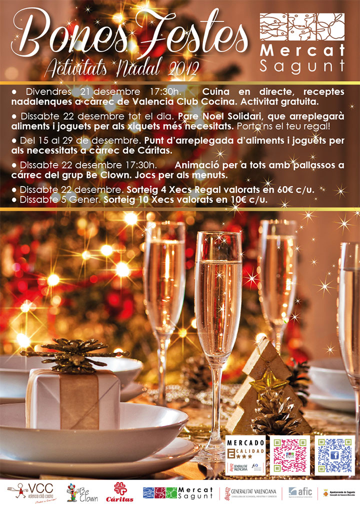El Mercado Municipal de Sagunto ha presentado el programa de actividades diseñadas dentro de la campaña navideña. La primera de ellas tendrá lugar el próximo viernes 21 de diciembre con una demostración de cocina en directo (showcooking) en la que se prepararán recetas con productos del propio Mercado para Navidad a cargo del Valencia Club Cocina (a partir de las 17.30 horas).